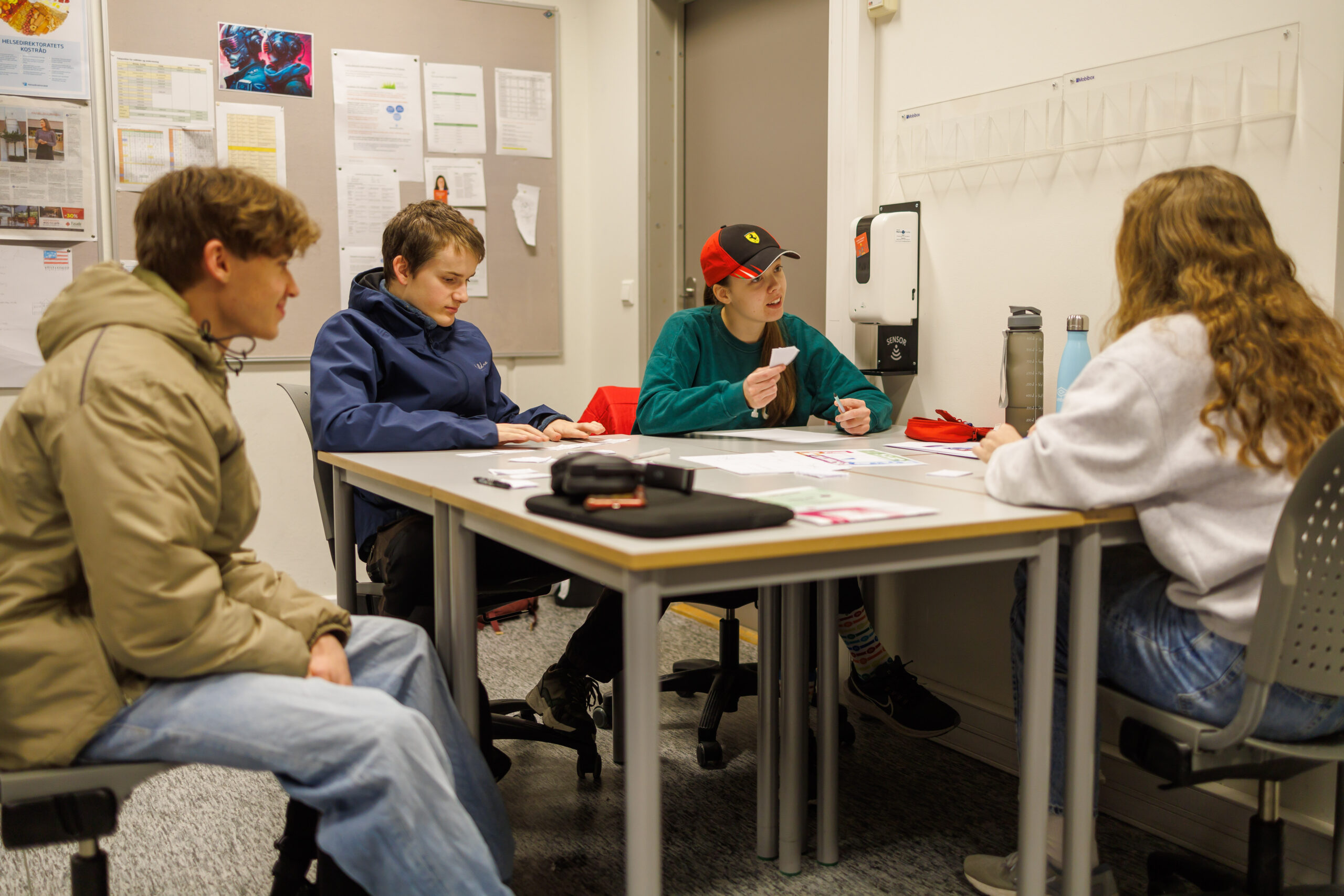 Ei av gruppene består av Lidia Stene, Camilla Skartveit, Jørgen Vik og Julian Rosså. Me skal ikkje røpa kva idear dei jobbar med, men samtalen om konseptet deira går friskt rundt arbeidsbordet i klasserommet.