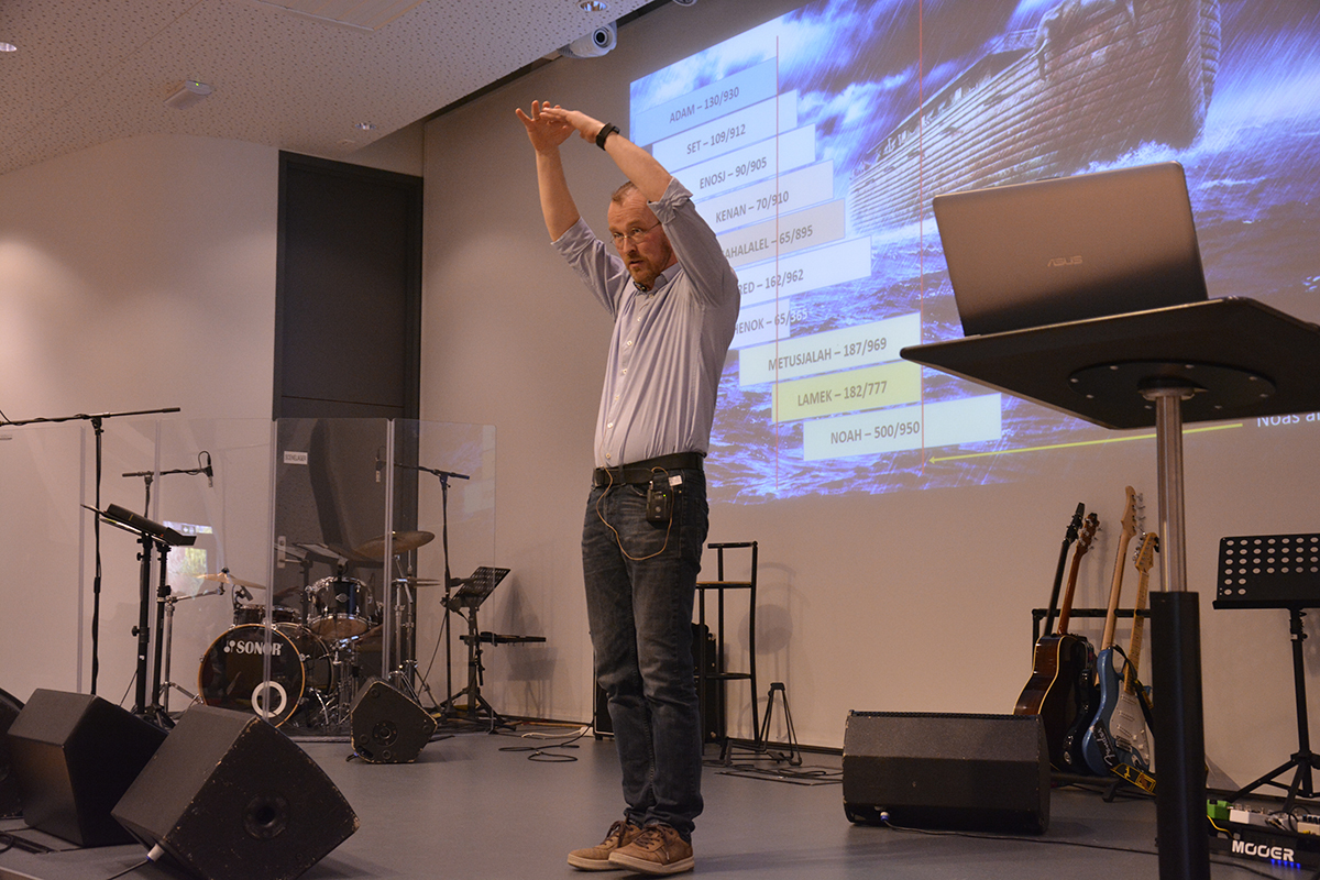 No har han nett lova dei frammøtte at dei i løpet av dei neste timane skal få læra bibelhistoria utanåt. Då trengst stikkord kombinert med rørsle, og Hjemdal går i gang med å fortelja om då Gud skapte verda, etterfølgt av historia om syndefallet, Noah og storflaumen og tårnet i Babel. For kvart stikkord lager han rørsler med hendene, slik at det skal vera lettare å hugsa. Og elevane gjentek.