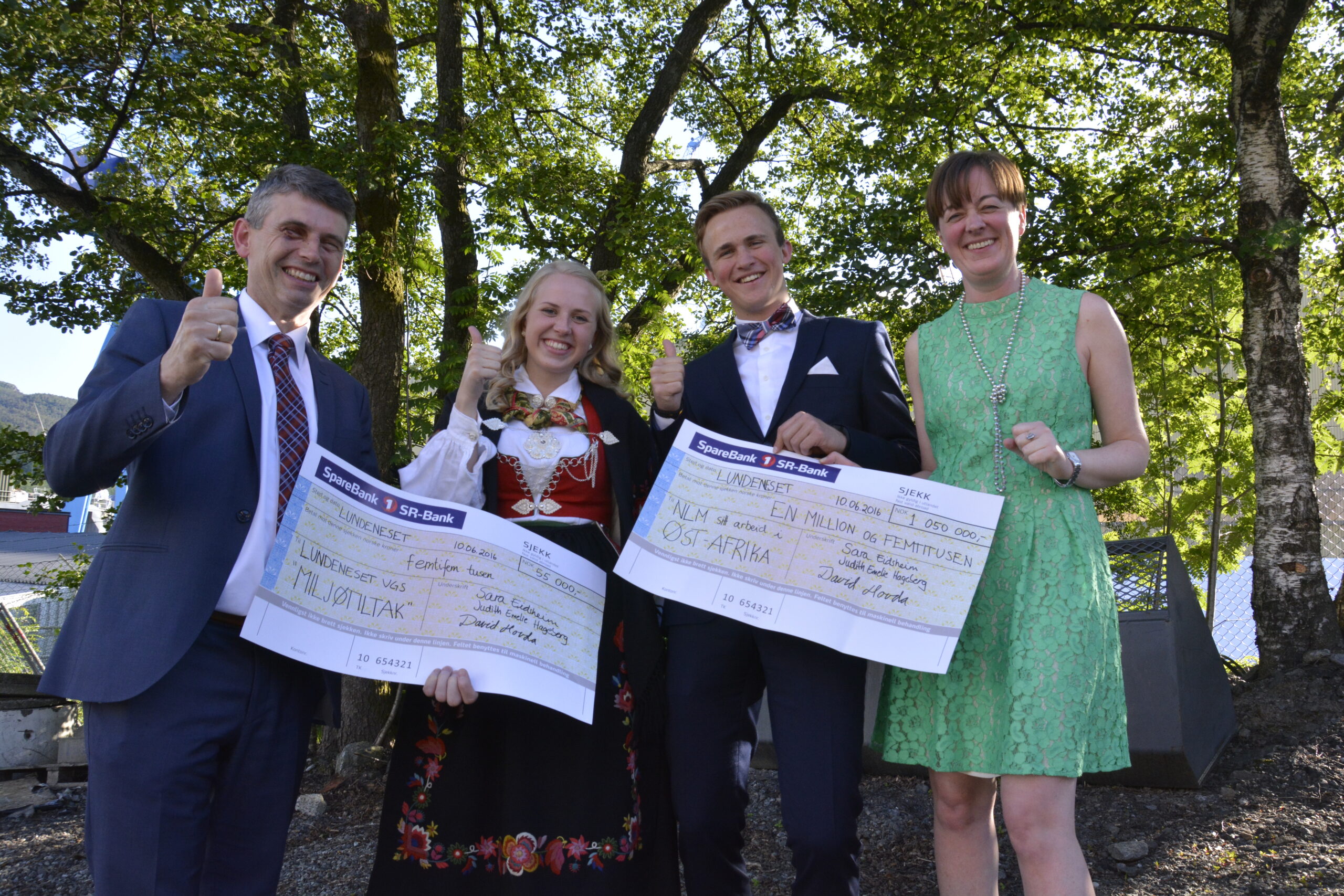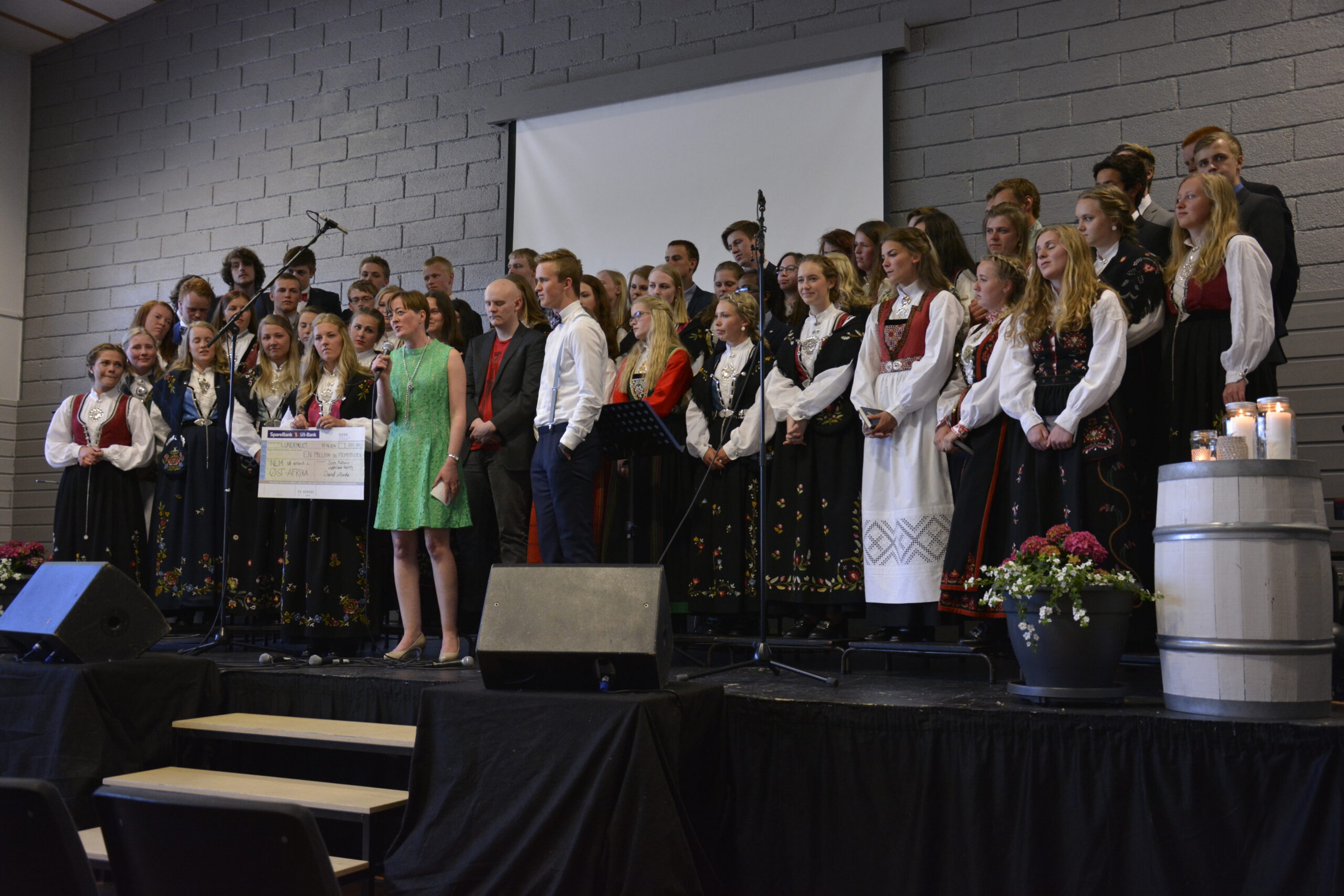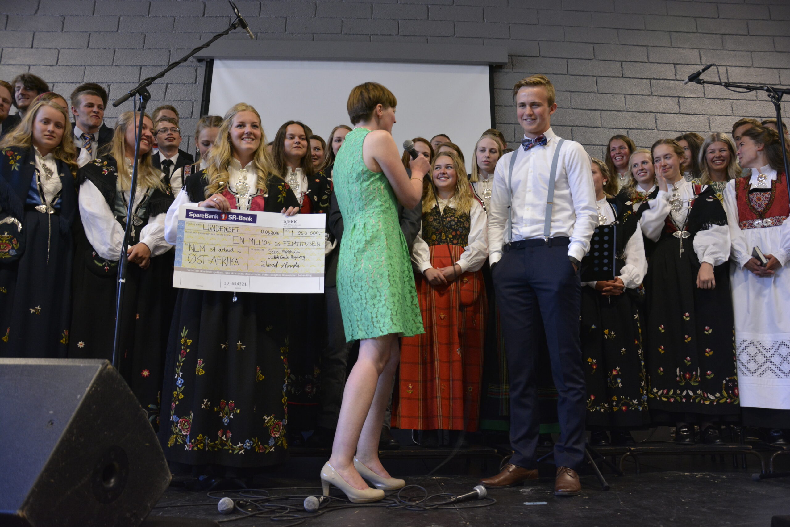 Sjekken med rekordbeløpet vart overrekt Norsk Luthersk Misjonssamband (NLM) ved informasjonsrådgivar Elise Haugland under skulen sin avslutningsfest fredag 10. juni. Ho takka for pengegåva og engasjementet, og håpte elevane ville ta med seg engasjementet for andre vidare i livet.